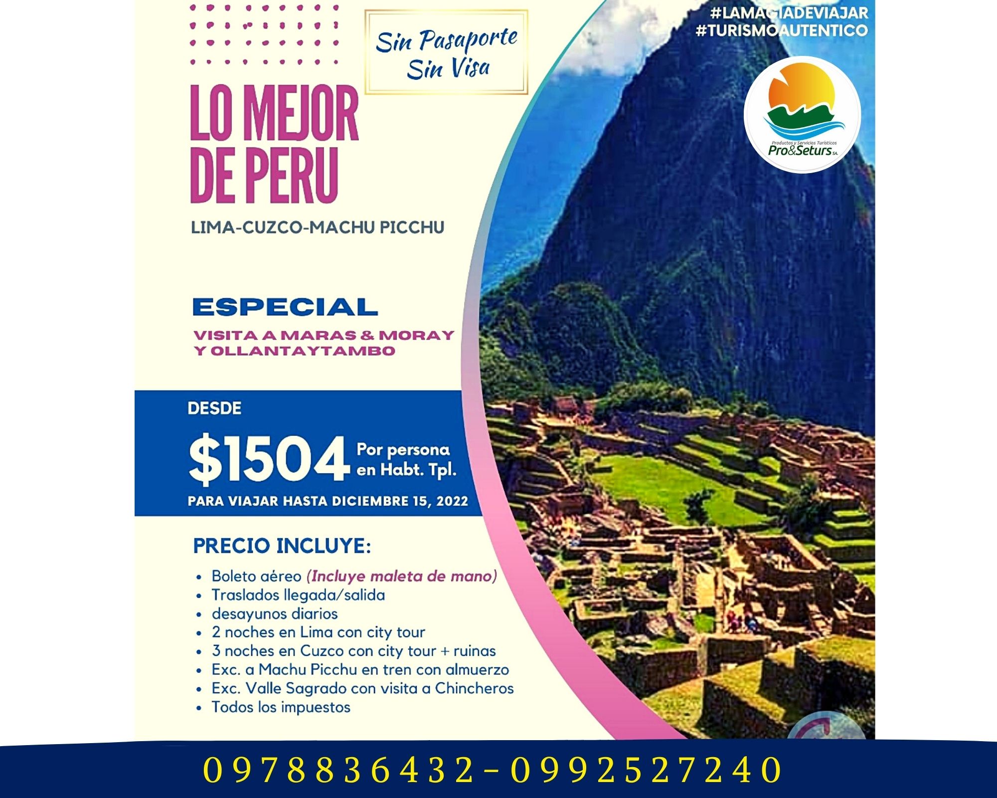 Niños e infantiles, favor consultar tarifas. Mínimo 2 personas viajando juntas. Suplemento pax viajando solo USD 124.00
